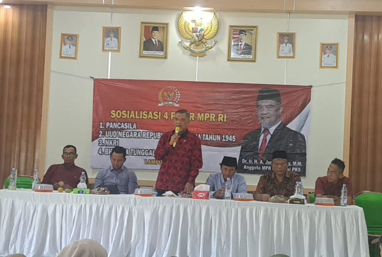 Lampung, kabarsenayan.com. — Anggota MPR RI Dr. Ir. H. A. Junaidi Auly, M.M. menyampaikan presentasi mengenai kebijakan publik dan nilai 4 Pilar MPR RI kepada para pemilih aktif, sebagai bagian dari upaya meningkatkan literasi kebangsaan dan partisipasi politik. Acara yang dihadiri oleh tokoh masyarakat, pemilih muda, serta perwakilan organisasi pemuda dan komunitas setempat berlangsung khidmat dan berkesan.(09/12/2025).