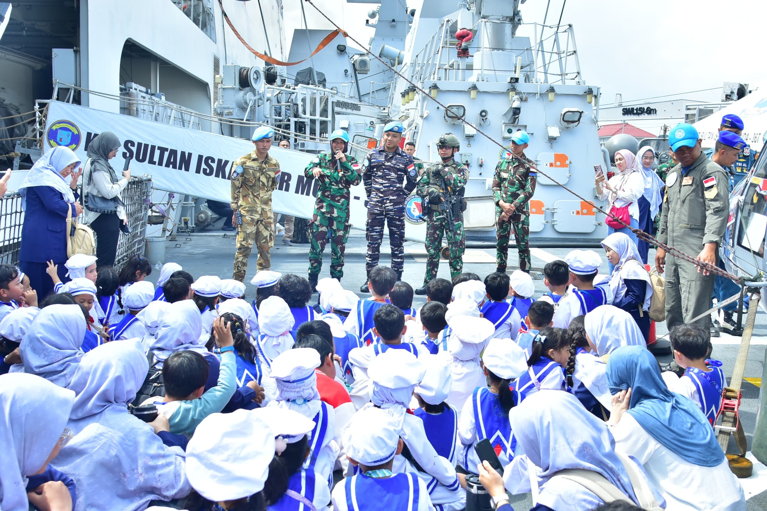 Kedatangan rombongan pelajar disambut hangat oleh prajurit KRI Sultan Iskandar Muda-367. Keceriaan terpancar dari wajah anak-anak saat menyaksikan dari dekat kapal perang hasil produksi dalam negeri tersebut. Dengan tertib dan penuh antusiasme, para pelajar satu per satu menaiki kapal, didampingi oleh personel KRI, untuk mengikuti rangkaian warship tour. Bagi sebagian besar dari mereka, kunjungan ini menjadi pengalaman pertama yang membekas, demikian pula bagi para guru pendamping.